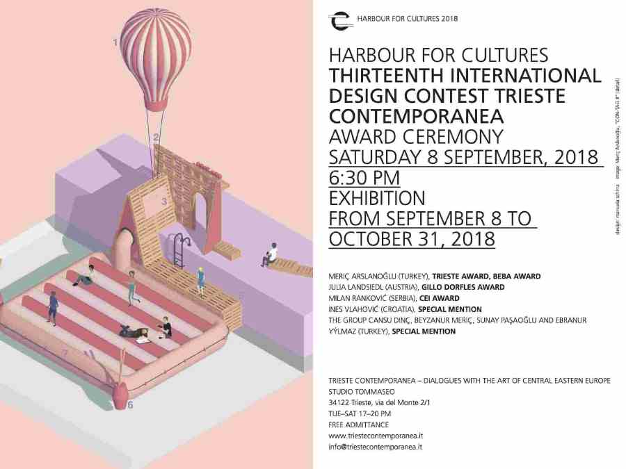 Sabato 8 settembre 2018 presso lo Studio Tommaseo si terrà la cerimonia di premiazione in concomitanza con l'apertura della mostra delle opere vincitrici del Tredicesimo Concorso Internazionale di Design Trieste Contemporanea, dedicato ad "Harbour for Cultures", progetto biennale che Trieste Contemporanea sta dedicando alle possibili dimensioni sociali e culturali di un'immagine di un nuovo “porto di culture”, a partire dall’attuale dibattito sulla riconversione reale del Porto Vecchio di Trieste.