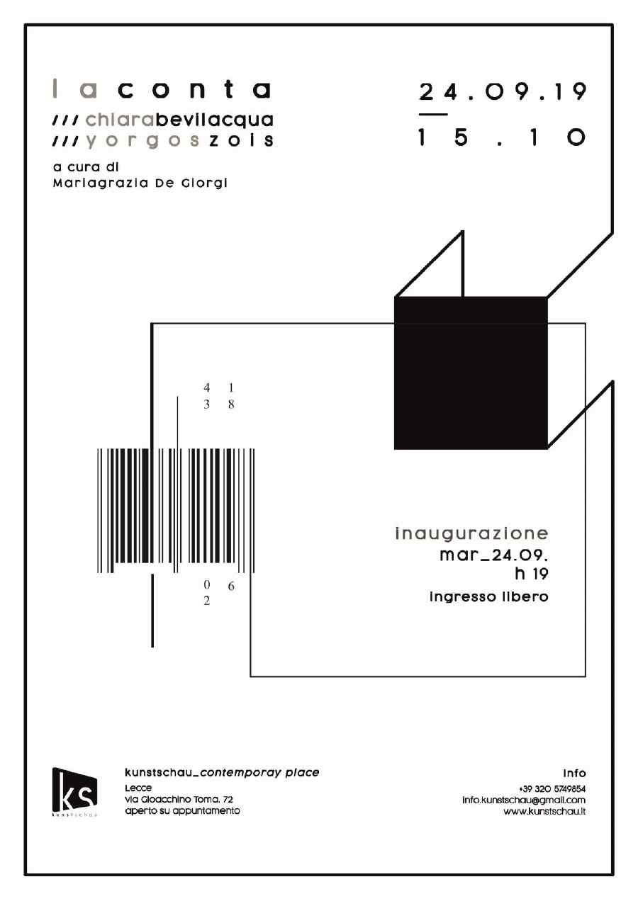 Martedì 24 settembre 2019 alle ore 19.00, Kunstschau_Contemporary Place a Lecce in via Gioacchino Toma 72, inaugura la mostra La conta con le opere di Yorgos Zois (Atene, 1982) e Chiara Bevilacqua (Lecce, 1983), a cura di Mariagrazia De Giorgi.