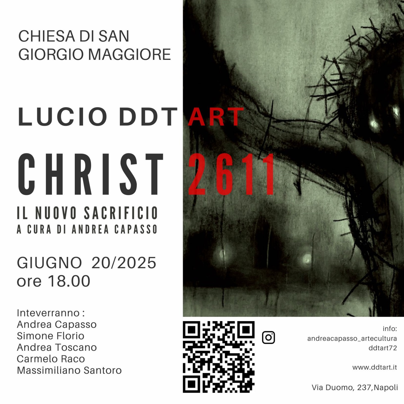 In data 20 giugno 2025, alle ore 18.00, presso la Chiesa di San Giorgio Maggiore (Via Duomo 237, Napoli) sarà nuovamente presentato al pubblico dell’arte il Christ 2611 del visionario artista LUCIO DDT ART. Dinanzi agli occhi dei convenuti si parerà il corpo del Salvatore rivestito di una nuova carne afflitta e martoriata, ma adattata, mutata e sopravvissuta all’interno di un tragico futuro postatomico. Sarà possibile un nuovo sacrificio capace di salvarci dalle nostre colpe?