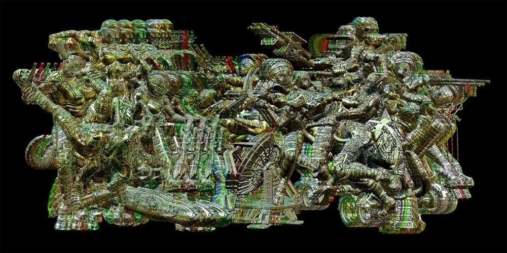 In parallelo, nell'opera video MOON DOLLAR BATTLE STEREO SCENES (2017), i gruppi scultorei tratti dal suddetto assembramento si alternano rapidamente in sequenze speculari dinamiche, esibendosi in un paradossale “fuoco incrociato”: è quasi una mitragliata visiva, un' esplosione d'armi e fuochi tradotta in luce digitale, connessione alla binocularità dello sguardo e analogia tra l' “aggressività" sull'occhio dello spettatore e il tema guerresco, nello pseudo abbagliamento causato dal flash dei veloci scatti di movimento, luce e colore.