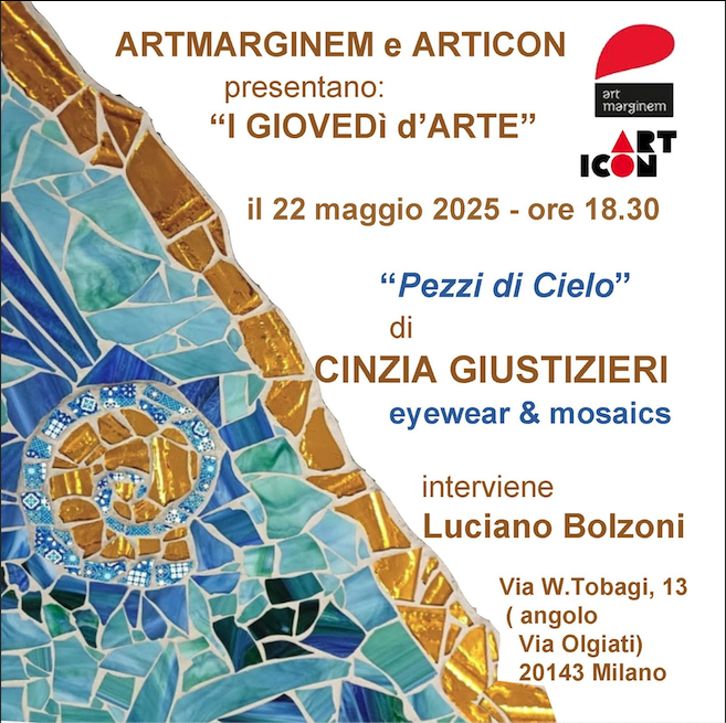 Cinzia Giustizieri, artista autodidatta milanese, espone li suoi ultimi lavori “eyewear & mosaics”. Attiva da oltre vent’anni nel mosaico e nella pittura, realizza opere con un forte impatto astratto e al contempo simbolico che si distinguono per l’uso di materiali come vetro opale, madreperla e pasta di vetro.
