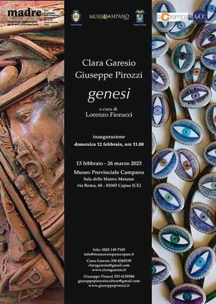 La bi-personale di Clara Garesio e Giuseppe Pirozzi dal titolo Genesi, a cura di Lorenzo Fiorucci, in programma al Museo Provinciale Campano di Capua dal 12 febbraio al 26 marzo 2023, propone al pubblico un duplice itinerario attraverso l’ampia e variegata produzione espressa dai due maestri nel lunghissimo percorso della loro attività artistica. Si tratta di un’accurata selezione di sculture prevalentemente fittili – tutti esemplari unici, tra cui alcuni bronzi e alcune opere storiche inedite – che dialogano tra loro, con gli spazi e con i reperti museali, così da stabilire rimandi tematici e di forma-colore-materia. Il fil rouge tra le opere esposte è rappresentato infatti dall’idea della rivelazione della vita come momento creativo e come dono e dal principio della nascita/genesi in quanto metafora dell’intuizione artistica, in relazione alla presenza pregnante delle sculture votive delle Matres Matutae, riproducenti l’antica divinità italica, venerata come dea del principio e della nascita e come protettrice delle partorienti.