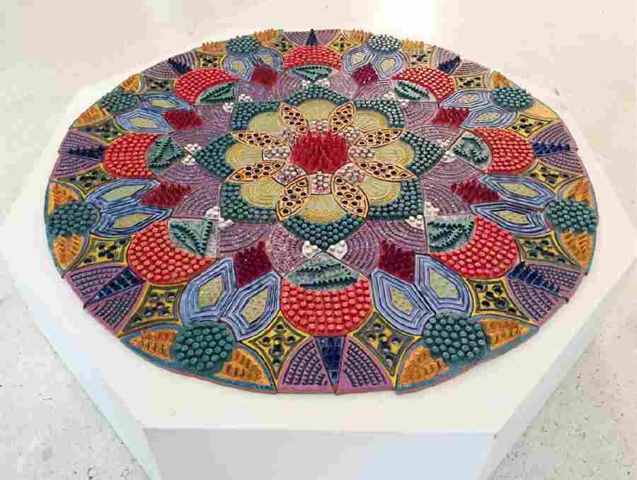 Emily Dickinson scrive: «noi non diventiamo vecchi, ma più nuovi ogni giorno» ed è a questa idea di costante rinascita nell'avanzare del percorso della vita che Clara Garesio ha dedicato il proprio lavoro Rebirth Mandala* (2012), una installazione costituita da 153 formelle ceramiche ad altorilievo di forma modulare, modellate a mano, dipinte con smalti policromi e composte in un disegno unitario del diametro di 160cm.