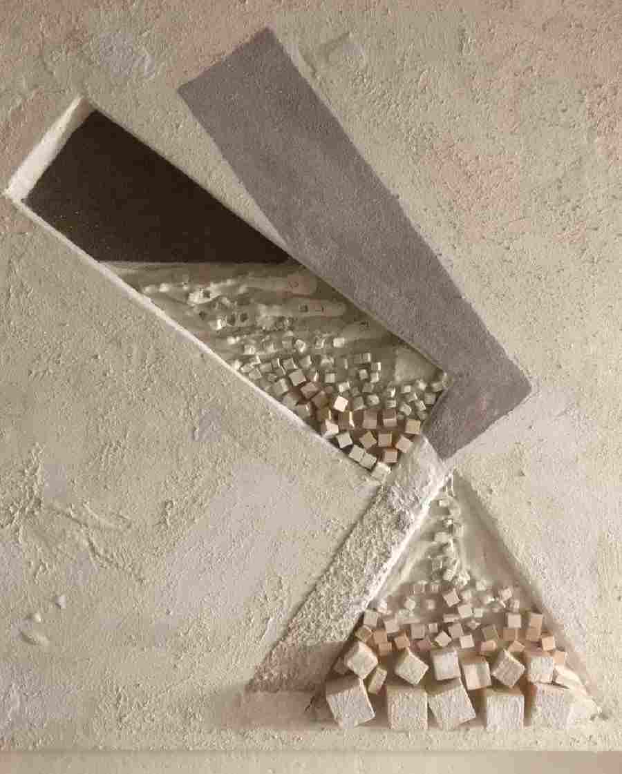 Triangoli, cerchi, quadrati, spigoli e non spigoli, materiali diversi secondo l'idiosincrasia del momento. La descrizione artistica che adotto è di tipo geometrico, in riferimento a Pitagora, filosofo presocratico ispiratore fin dall’inizio della mia attività artistica, per il quale il principio di tutto (l’arche’) era il numero, e la forma geometrica era la sua visione dell’universo, anche del pensiero. (Claudia Marinoni)