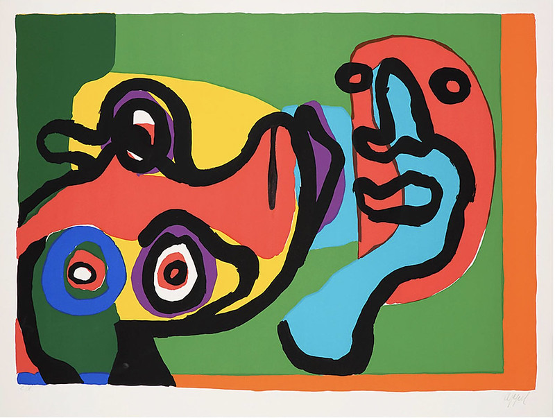 In qualche modo l’esperienza dell’internazionale Situazionista, nata nel 1957 a Cosio d’Arroscia, fu generata da una breve, intensa e lungimirante avventura artistica conosciuta come C0.Br.A. Il gruppo deve il nome alle città di provenienza dei fondatori, Copenaghen, Brussels, Amsterdam. Asger Jorn, Pierre Alechinsky, Karel Appel e altri tra cui Corneille. Nonostante la breve durata ( dal 1948 al 1951, con solo due mostre all’attivo ) quel modo di fare arte, così “brutale”, immediato e istintivo cambiò il modo stesso di intendere la pittura e la stessa idea di opera artistica. La critica radicale del mercato arrivò fino a cambiare la percezione del rapporto tra opera, artista e collezionista, e pose le basi per giungere qualche anno dopo alla provocatoria pittura industriale venduta a metro del “Situazionista” Pinot Galizio. In realtà gli Artisti del Co.Br.A. furono sperimentatori di nuove tecniche, facendo della riproduzione seriale di un’opera d’arte una esperienza non solo legata alla necessità di rendere l’accesso all’arte più economico ( e quindi più “democratico) . Le opere vennero “pensate” per essere riprodotte con tecniche di stampa particolari, spesso rese di fatto uniche con interventi originali e specifici sulle diverse copie, e gli stampatori vennero coinvolti nella creazione artistica. E’ particolarmente significativa in questa ottica l’esperienza dei Fratelli Pozzo di Torino e delle loro Edizioni d’Arte, dirette non a caso da Ezio Gribaudo, Artista poi divenuto Presidente Emerito della Accademia Albertina di Torino. La Prova d’Artista di Asger Jorn del 1970, che esponiamo in questa occasione, proviene da questa esperienza. La Prova d’Artista di Karel Appel , iconica nel linguaggio estetico di quel movimento, è stampata su pergamena, mentre la Prova d’Artista di Pierre Alechinsky è realizzata con tecniche diverse, dall’incisione alla fotografia. Certamente ci furono anche Artisti che della serialità dell’opera d’arte fecero un uso più “estetico” e conseguentemente commerciale, come testimonia la litografia di Corneille, ancorché realizzata in una bassa tiratura.