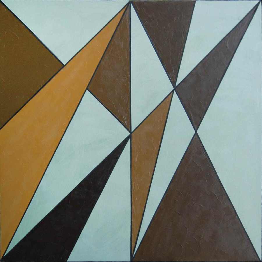 Così, Bruno De Santi ha ripreso a costruire i suoi reticoli di linee, le sue campiture di colore à plat, tutte giocate su scarti e intervalli tonali: i dedali di stanze triangolari in cui scompone la superficie rettangolare o quadrata della tela esaltandone la bidimensionalità ed attribuendo all’azione pittorica compiti di spiccata, controllatissima razionalità. La stesura del colore è compatta, meticolosa, misurata, senza nulla concedere alla gestualità: simula la perfezione della macchina. Pur mediando da Mondrian l’approccio di assoluta astrazione, De Santi evita sistematicamente di allineare le sue composizioni sugli assi cartesiani, per privilegiare il gioco dinamico di diagonali, usando il triangolo (anziché il quadrato) come modulo compositivo, come unità di misura. Talvolta l’articolazione dei triangoli dà vita a strutture spiraliformi che ricordano labirinti, oppure rose, reticolati, piramidi sezionate, tagli di luce prodotti da un gioco incrociato di fari… ma non credo che ci sia mai nessuna vera intenzione di rappresentazione neppur vagamente icastica, realistica. Ciò che conta è l’equilibrio (o il disequilibrio) che deriva dal gioco sapiente di giustapposizioni o contrapposizioni di triangoli colorati, spesso dipinti tono su tono: il modo in cui tale gioco cattura l’attenzione, intrappola lo sguardo del fruitore. Poco importa se si tratta di un gioco apparentemente semplice, elementare, fatto di poco o di niente, solo linee e colore piatto… (Ma davvero è così semplice? O si tratta piuttosto di quella “difficilissima facilità” di cui parlava l’Ariosto, così ardua da conquistare?). Quello che conta è che il meccanismo scatti, affinché una parte dell’anima del fruitore possa rimanere impigliata in queste trappole di colore, in questi labirinti astratti, mentali, come sospesa fuori dal tempo, partecipe di una dimensione astrale, ideale, eterna, che sarebbe piaciuta a Platone. Amen.