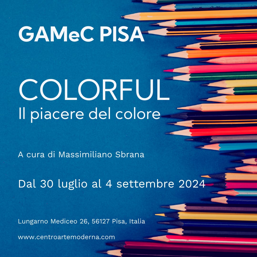 Dopo una breve pausa, riprende l'attività espositiva del GAMeC CentroArteModerna di Pisa (Lungarno Mediceo,26), con la mostra collettiva "Colorful: Una estate a Colori" inserita nel programma dell'Estate Pisana 2024 dal 30 Luglio al 4 Settembre 2024.