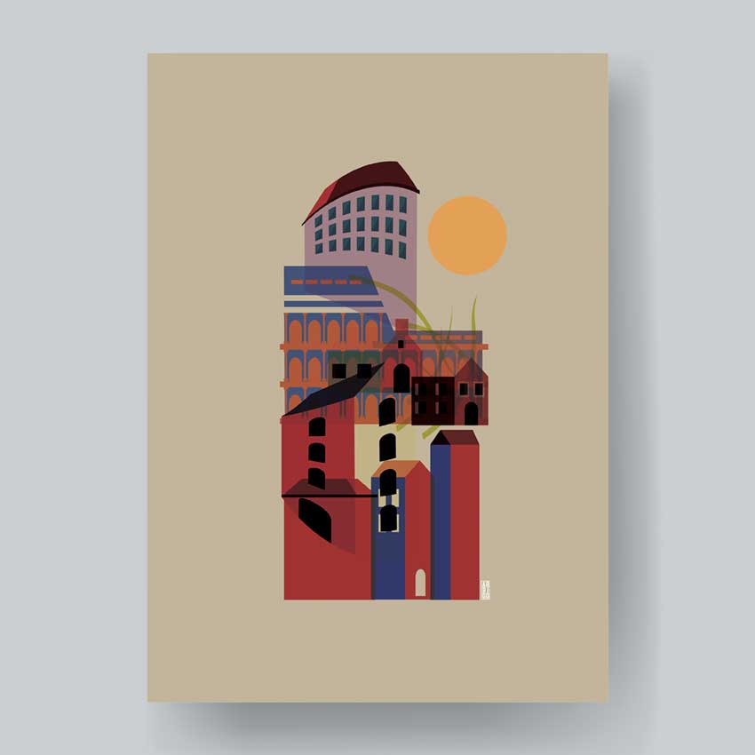 Monti non è solo un Rione e non è solo un quartiere di Roma. Monti è un piccolo paese con artigiani e botteghe che resistono strenuamente al convertirsi in negozi di massa uguali a tanti altri. Ci sono gallerie d'arte e studi di artisti ma la cosa che mi ha sempre affascinato Arrigo sono i colori delle case che risplendono e cambiano rispetto alla luce durante la giornata. Piccole vie dove gli edifici compongono una scenografia unica. Arrigo ha voluto interpretare con il suo segno, le sensazioni che mi avvolgono mentre si perde nelle strade del Rione.