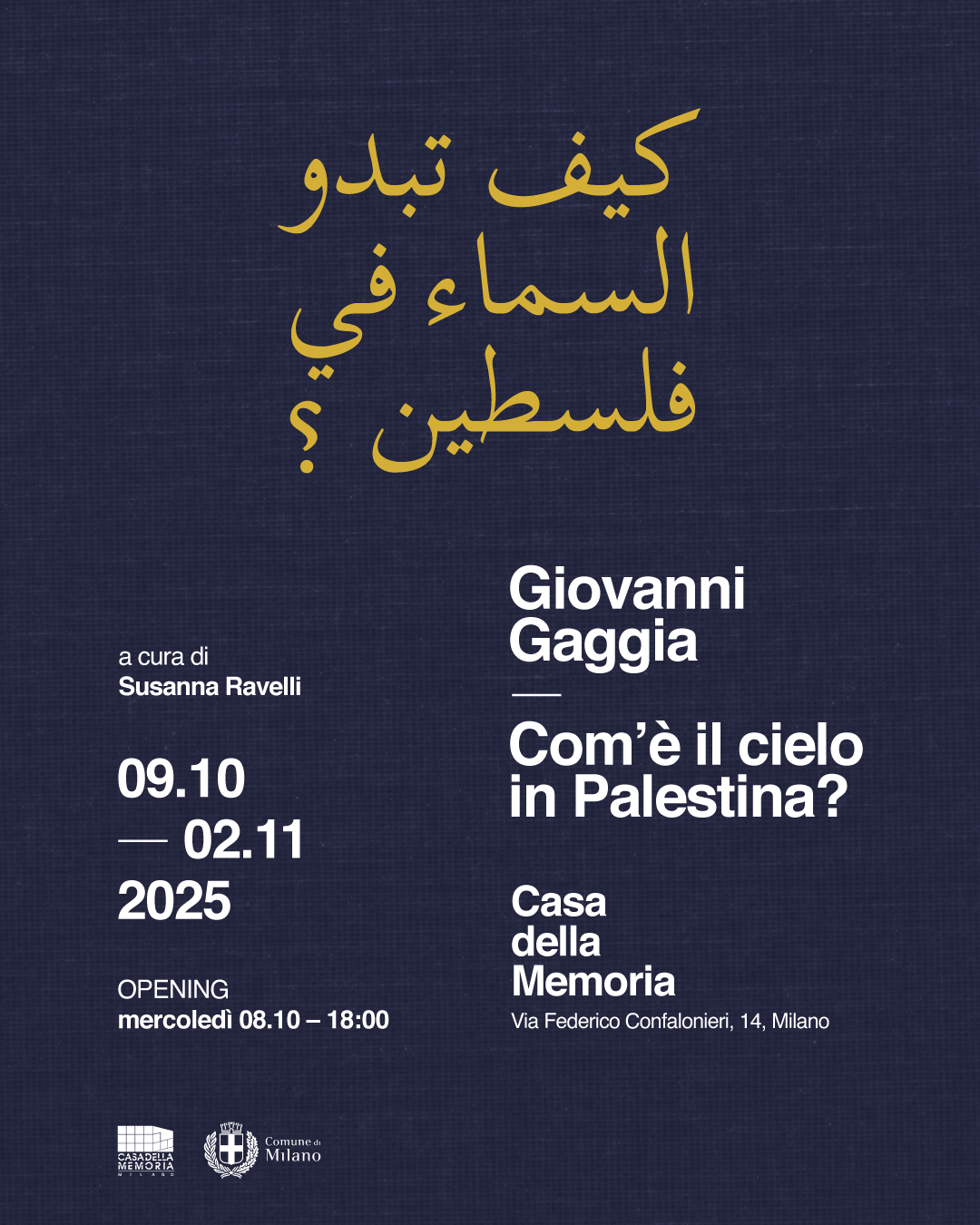La Casa della Memoria di Milano accoglie, dal 9 ottobre al 2 novembre 2025, la personale di Giovanni Gaggia Com’è il cielo in Palestina? a cura di Susanna Ravelli e la direzione generale di Maria Fratelli. L’allestimento della mostra si intreccia con la struttura degli archivi verticali presenti in sede, proponendo una riflessione civile e poetica sull’urgenza etica di prendere posizione attraverso l’arte contemporanea.