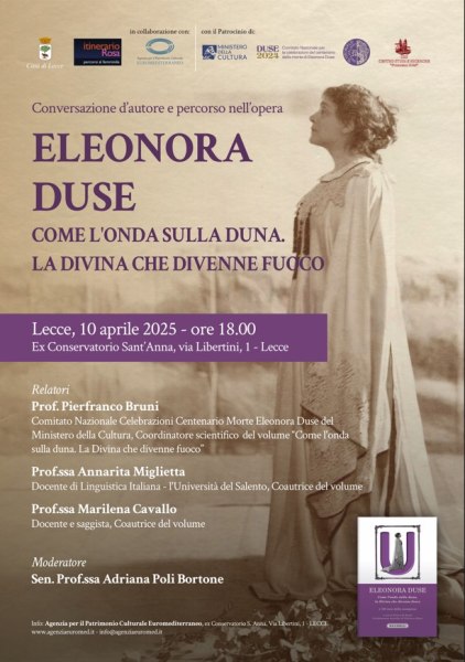 Partendo dall'analisi del libro Come l'onda sulla duna, la Divina che divenne fuoco, gli interventi del Prof. Bruni e della Prof.ssa Miglietta e della professoressa Cavallo, esploreranno la figura di Eleonora Duse, sottolineando come la sua arte continui a ispirare e a risuonare nella modernità. La sua capacità di esprimere emozioni universali e la sua indipendenza come donna e artista saranno al centro del dibattito, evidenziando come la "Divina" sia sempre rimasta assoluta protagonista sul palcoscenico della Storia. Come una fiamma inestinguibile, la sua eredità artistica e il suo spirito rivoluzionario continuano a bruciare, illuminando il presente e ispirando le future generazioni.