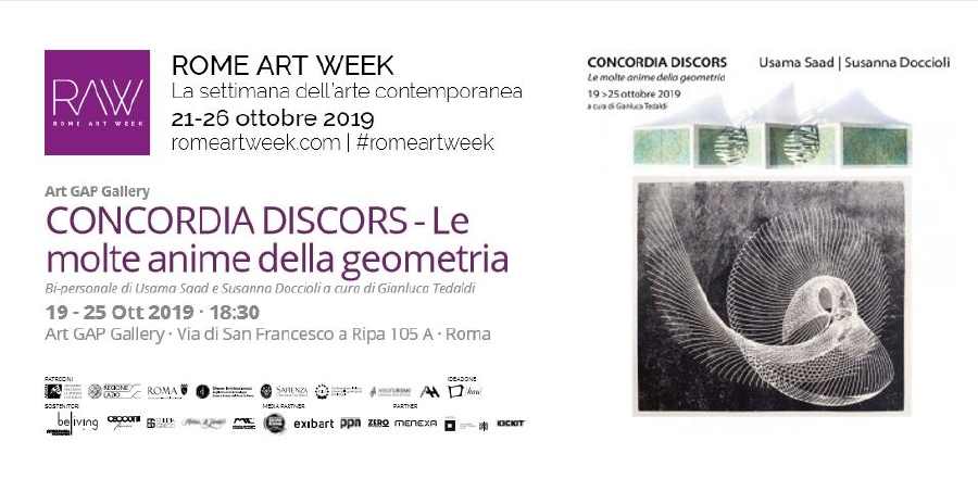 In occasione di Rome Art Week (RAW) la galleria Art GAP è lieta di accogliere, dal 19 al 25 ottobre 2019, la mostra bi-personale, Concordia Discors – Le molte anime della geometria, degli artisti Usama Saad e Susanna Doccioli a cura di Gianluca Tedaldi.