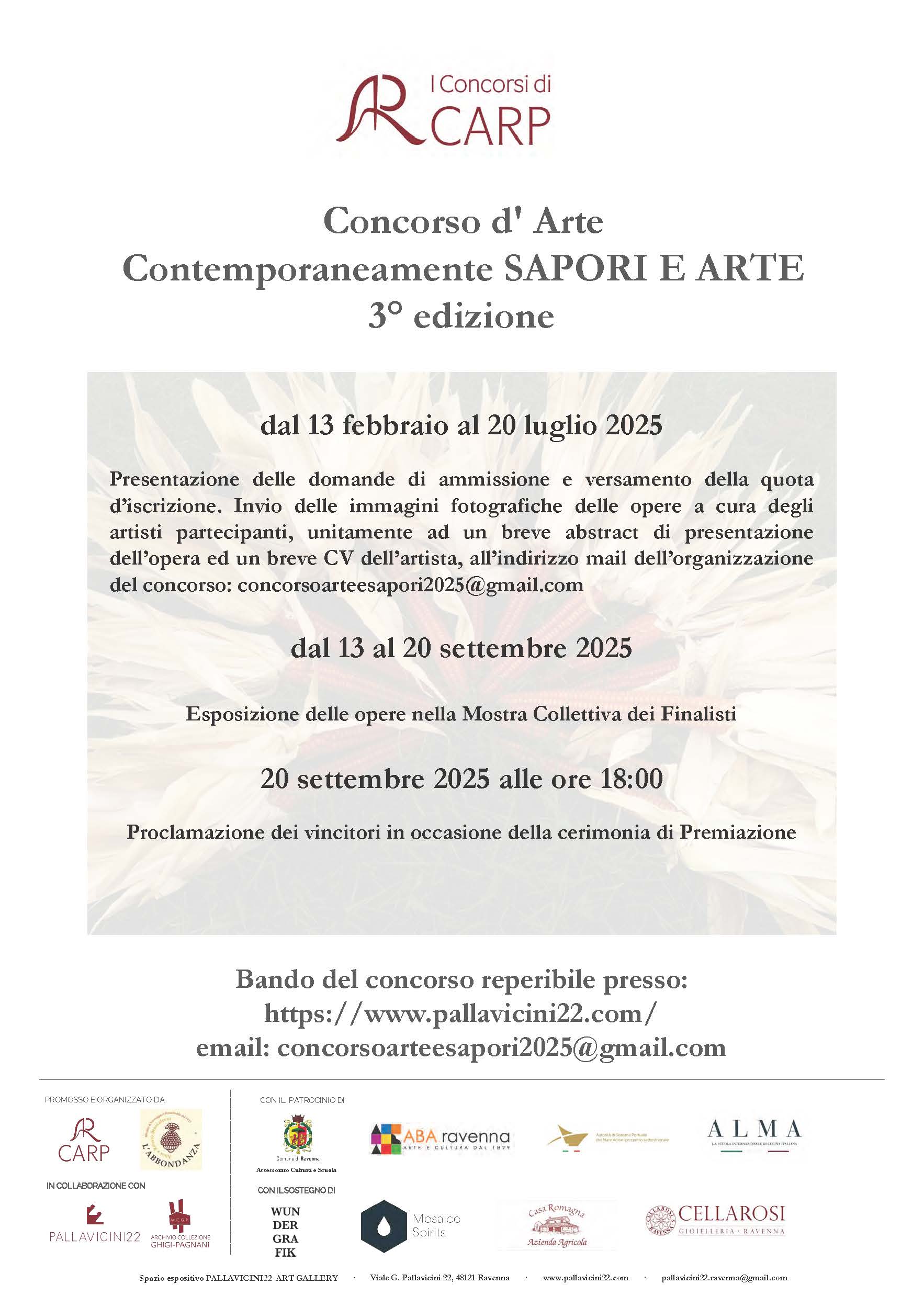 Il bando del Concorso può essere scaricato dal sito di Pallavicini22 oppure richiesto all’indirizzo mail: concorsoarteesapori2025@gmail.com.