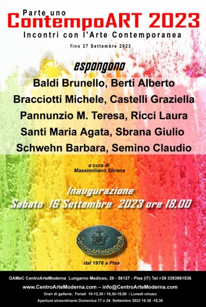 Si inaugurerà Sabato 16 Settembre 2023 alle ore 18,00 presso gli spazi espositivi della Galleria d'Arte Moderna e Contemporanea CentroArteModerna di Pisa, a cura di Massimiliano Sbrana, sul Lungarno Mediceo al n.26, la XXVIIIa Edizione di "ContempoART 2023 / Incontri con l'Arte contemporanea (Parte uno) " .