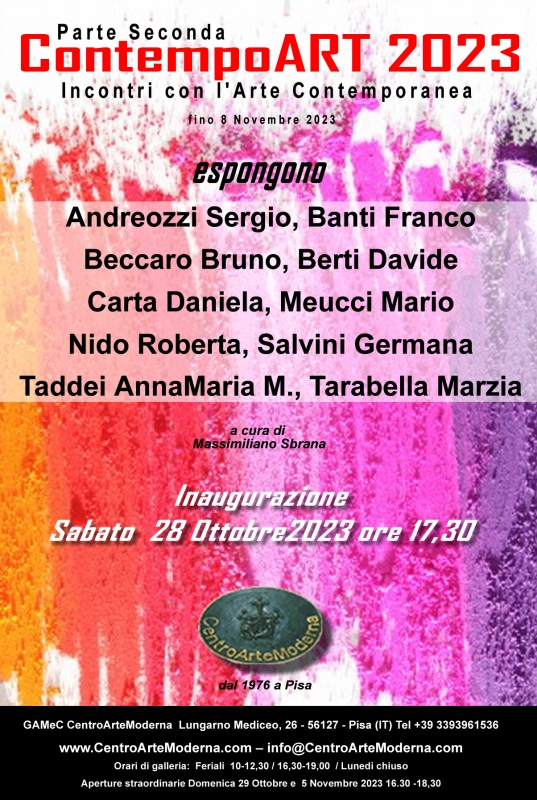 Si inaugurerà Sabato 28 Ottobre 2023 alle ore 18,00 presso gli spazi espositivi della Galleria d'Arte Moderna e Contemporanea CentroArteModerna di Pisa, a cura di Massimiliano Sbrana, sul Lungarno Mediceo al n.26, la XXIXa Edizione di "ContempoART 2023 / Incontri con l'Arte contemporanea (Parte seconda) " .