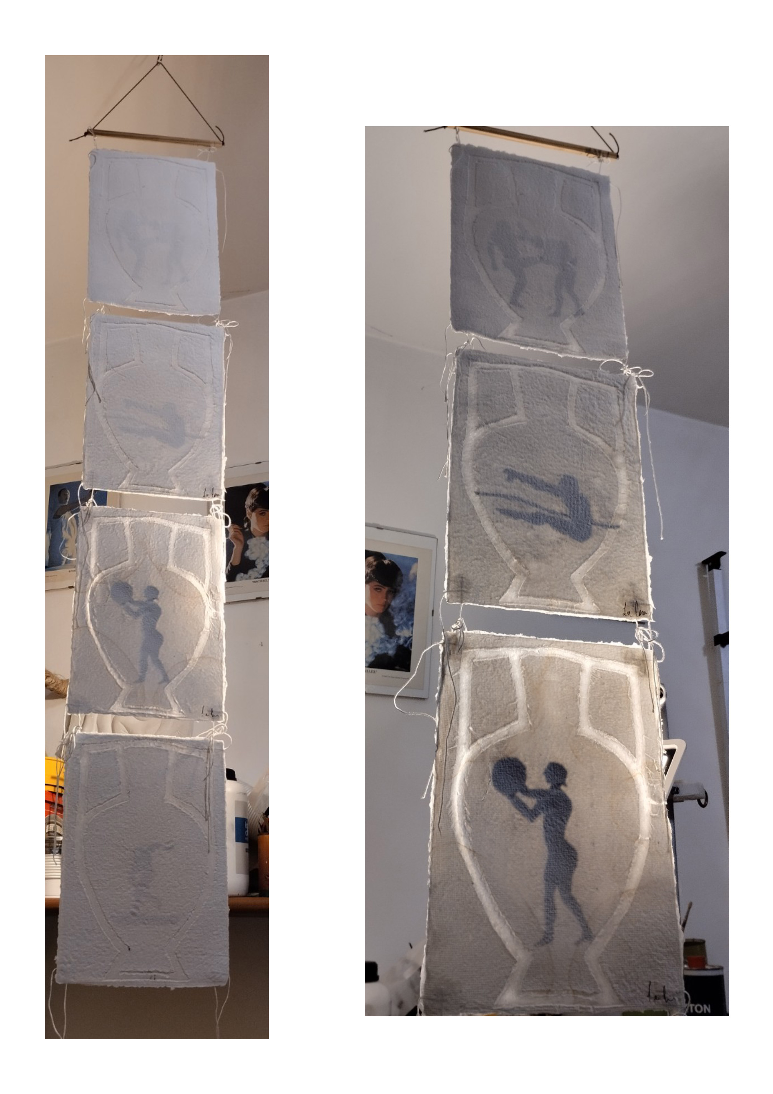 Tra le opere esposte: “Pompei” e “Olimpiadi” dell’artista creativa Carmela Lorusso, che in questi lavori ha utilizzato carta fatta a mano e la tecnica della filigrana.