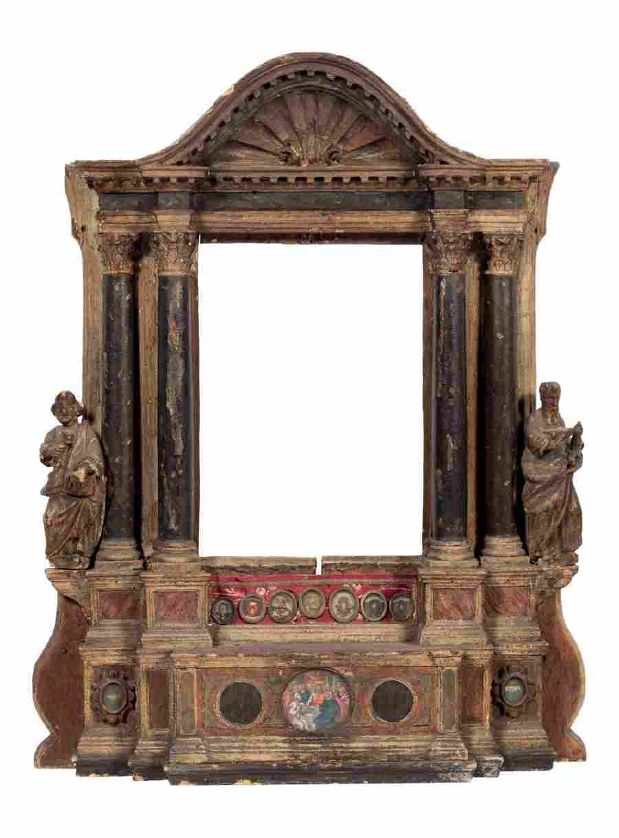 Se da un lato il catalogo del 18 aprile offre un bel nucleo di cornici toscane in lacca nera e oro, sempre desiderate dai collezionisti come l’esemplare fiorentino degli inizi del XVII ornato da un bel cimiero intagliato a volute la cui stima è di 2.500/3.500 euro, dall’altro non mancano le varietà di ordini e di intagli tipici della produzione emiliana e piemontese del Seicento, caratterizzate da una preziosa doratura che riesce a valorizzare ancor di più il virtuosismo degli ebanisti, spesso capace di realizzare delle vere e proprie opere di scultura a tutto tondo.