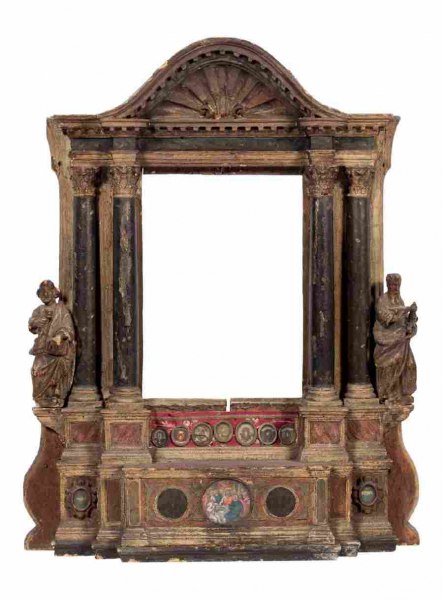 E poi l’immancabile Sansovino, una tipologia di cornice che ebbe molta fortuna nell’area adriatica e in quella fiorentina all’inizio del XVI secolo, sviluppata con diverse variazioni sul tema, sempre a rappresentare una vera innovazione rispetto all’idea di cornice utilizzata fino a quel momento. E tale è una Sansovino seicentesca in legno intagliato, dorato e laccato che è inserita in catalogo con un valutazione di 4.000/6.000 euro.