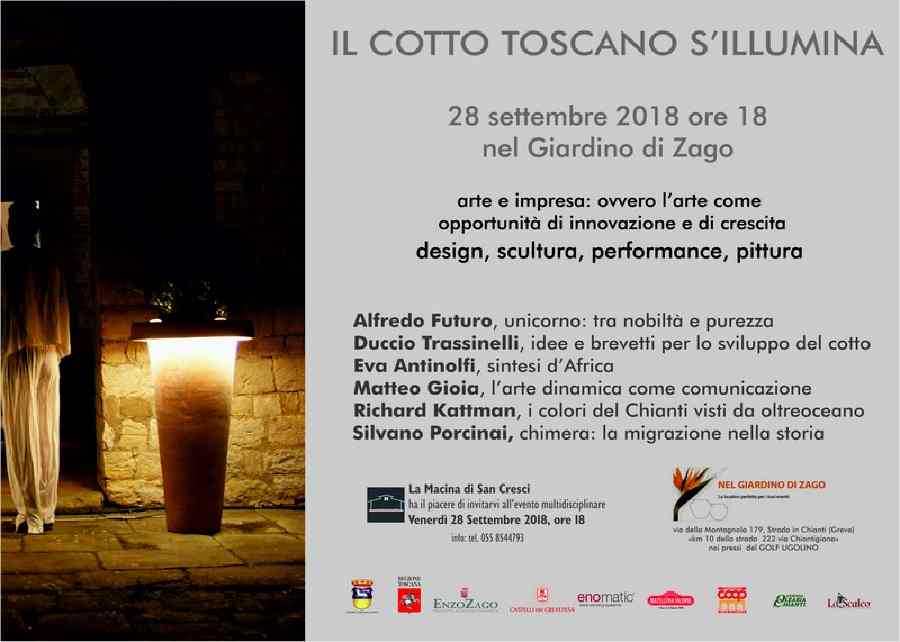 “Il cotto toscano s’illumina” ha un duplice significato: proprio e metaforico; quello proprio attraverso la ricerca e sperimentazione delle lampade per esterni di Duccio Trassinelli , intese a valorizzare in chiave contemporanea un materiale tipico della tradizione toscana; quello metaforico relativo a porre attenzione e far luce, in un momento che appare buio, su problematiche sociali particolarmente attuali: è il tema della migrazione affrontato da Silvano Porcinai con una imponente scultura, una moderna colonna traiana che racconta scene ambientate in contesti ben caratterizzati; anche i due giovanissimi artisti Eva Antinolfi e Matteo Gioia riflettono e si fanno portavoce di una consapevolezza sociale e civile, l’una con la realizzazione di una serie di maschere in terracotta riprendendo un’ iconografia tipica del continente africano, a voler sottolineare come “ l’arte nera” ha influenzato molti artisti occidentali, il più importante dei quali sicuramente Picasso; Matteo Gioia attua una performance con l’opera dinamica “Distruzione e speranza”, una sorta di catarsi, una liberazione possibile attraverso l’arte. In tale contesto collettivo si erge l’Unicorno di Alfredo Futuro, scultura in ferro e alluminio, simbolo di nobiltà e purezza, presagio favorevole, spinta propulsiva che parte da un territorio carico di storia e di bellezza; una bellezza traslata nei grandi quadri dell’artista americano Richard Kattman, che fa vivere il Chianti con colori intensi e mano astratta.
