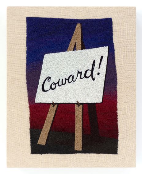 "Vigliacco !" è una raccolta di diciannove nuovi lavori realizzati nel 2022, ricami e ricami su tessitura jacquard, esplorando la mia vigliaccheria. Riguardano la paura di perdere. Si tratta di trovare scorciatoie e prenderle. Riguardano il lasciare le cose incompiute nel tentativo di evitare ogni finalità. Si tratta di preoccuparsi al punto da annodarsi.