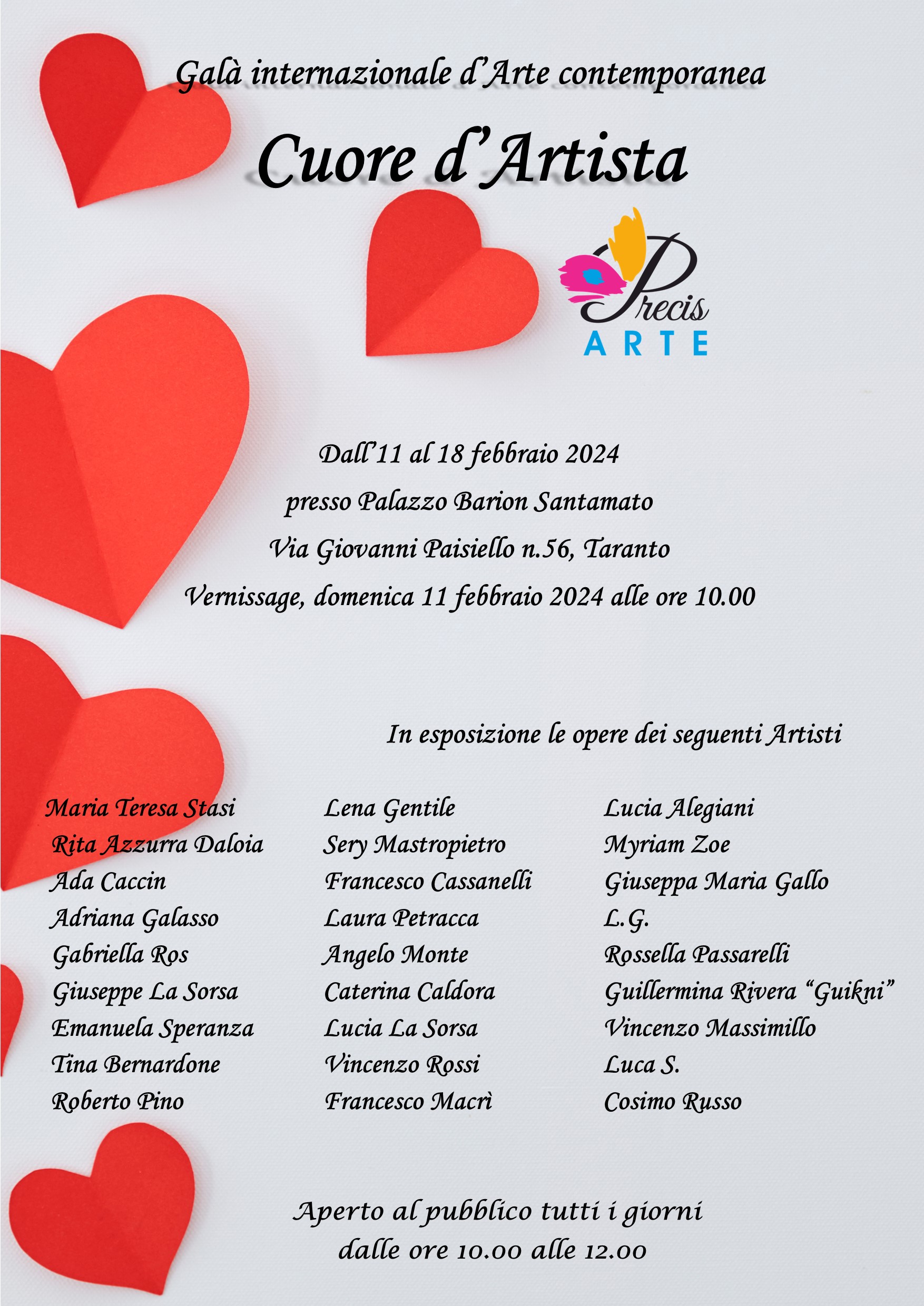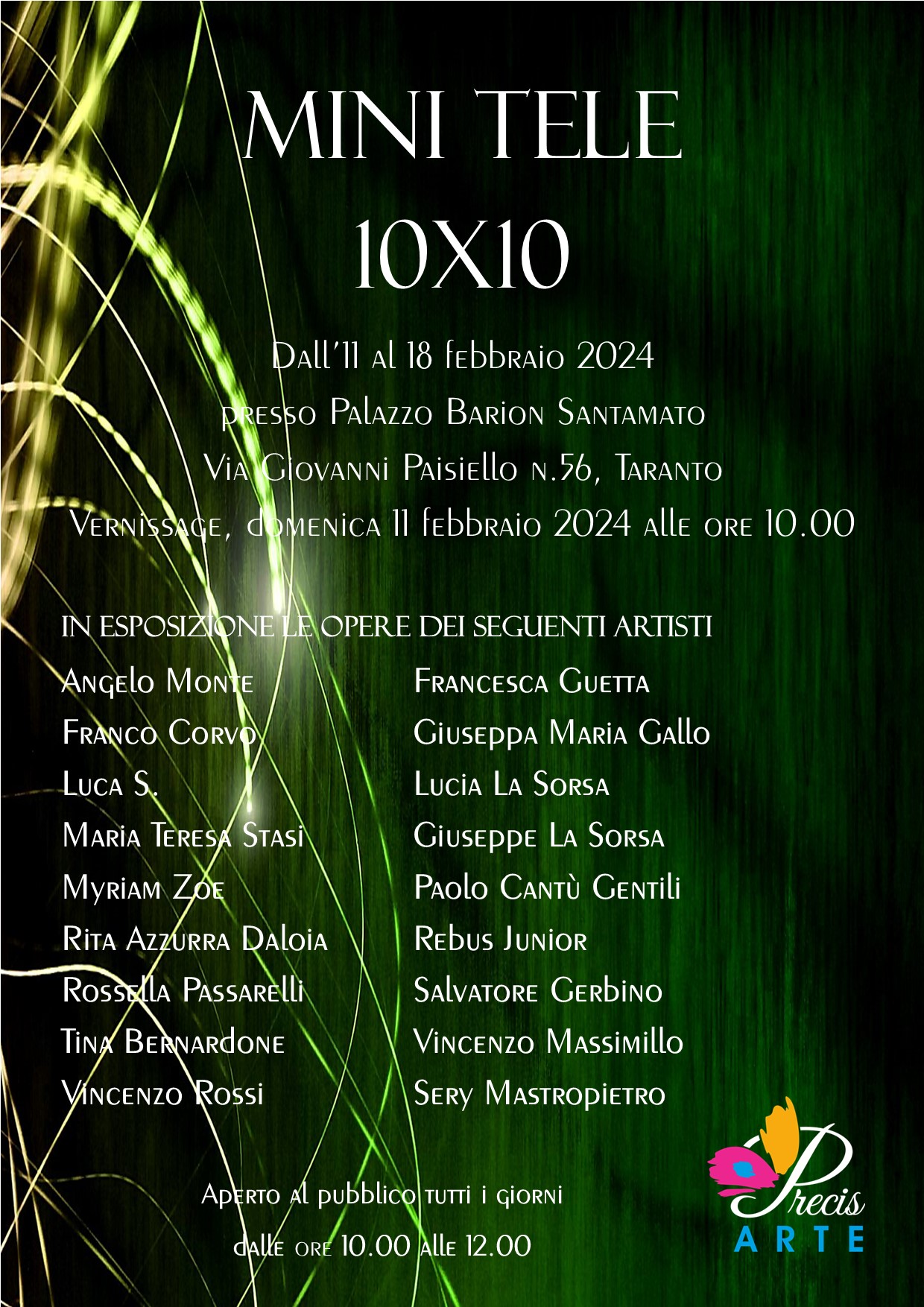 Domenica 11 febbraio 2024 presso il piano terra di Palazzo Barion Santamato, sito nel borgo antico di Taranto in via G. Paisiello n.56, la Precis Arte di Lucia La Sorsa ha organizzato un doppio evento espositivo dedicato all’Arte ed alla cultura.