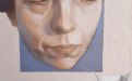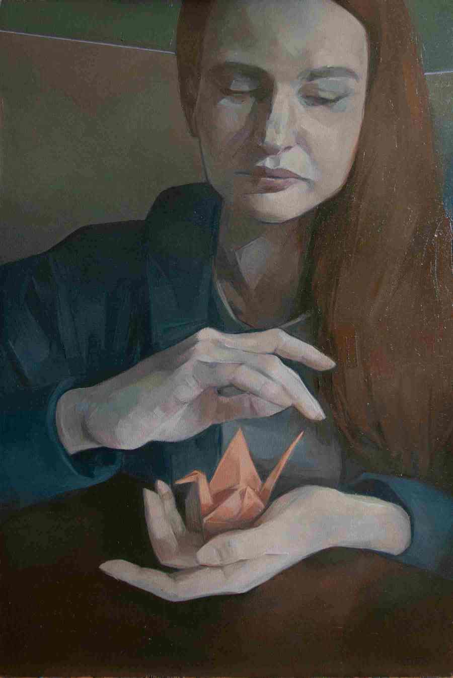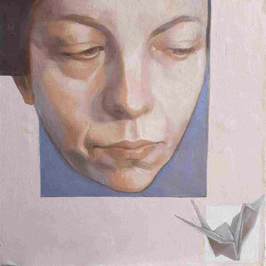 Ideato in pieno lockdown, “Autoritratto al chiuso” riflette sulle sensazioni e dimensioni ristrette vissute in fase pandemica. Come in una piccola installazione, l’artista presenta la sua stessa immagine dipinta racchiusa in uno spazio limitato, che può rivelarsi sia asfissiante, sia protettivo se percepito come un invito all’introspezione e alla scoperta di un altro sé. L’accostamento visivo del proprio volto malinconico con un piccolo origami a forma di gru, che ritorna anche in lavori successivi, esplicita il bisogno di leggerezza e di evasione.