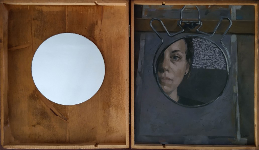 Scatole attraverso le quali vedere e al tempo stesso vedersi dall’interno: è questo il leitmotiv su cui si sviluppa la recente ricerca di Linda Aquaro, iniziata nel 2020 con un autoritratto su tela contenuto in una semplice scatola da vino riciclata.