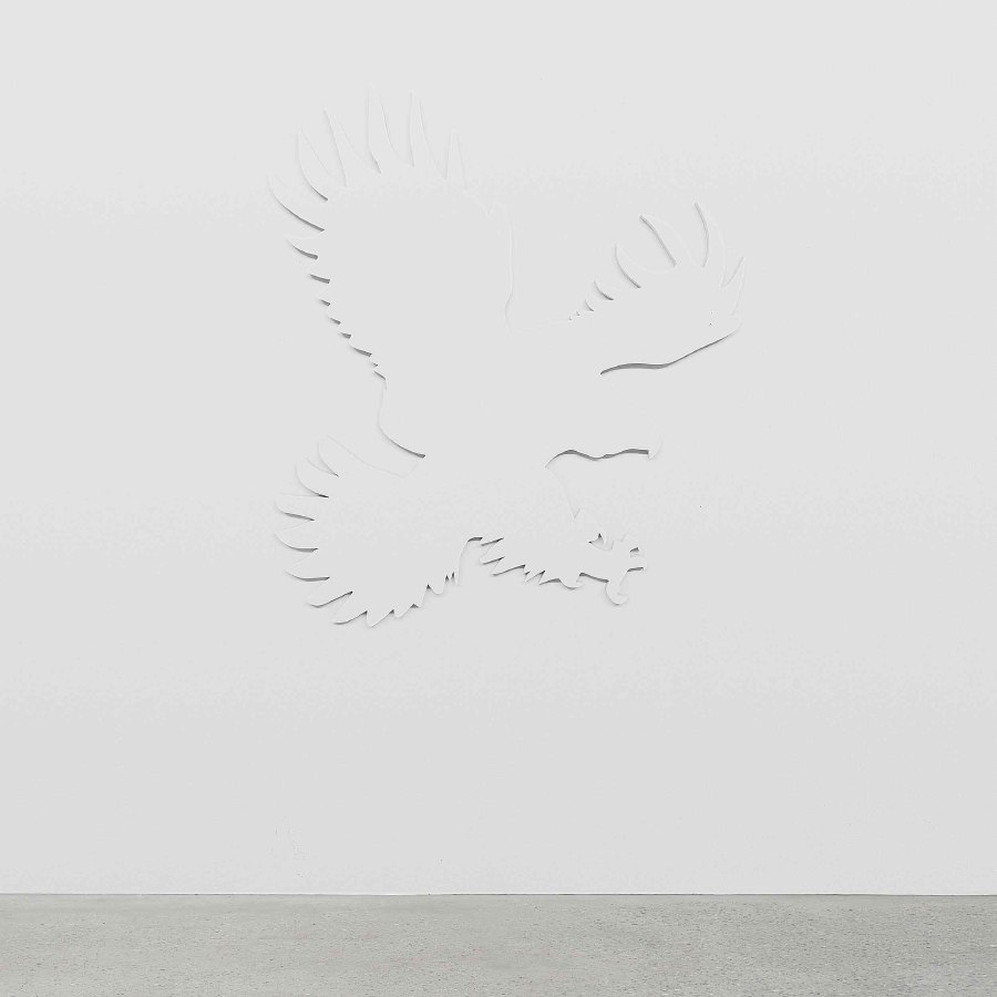 Ispirate a due universi complementari, la flora e la fauna, queste forme di eco simbolista tratte da loghi, insegne e illustrazioni, emergono dalle pareti della galleria assumendo al primo piano le fattezze di fieri rapaci e al piano inferiore, quelle di alberi di diverse specie. Sagome dai contorni definiti prive di ogni dettaglio che, attraverso l’uso della stilizzazione digitale elaborata dall’artista, spaziano dai rimandi pop a quelli minimal.