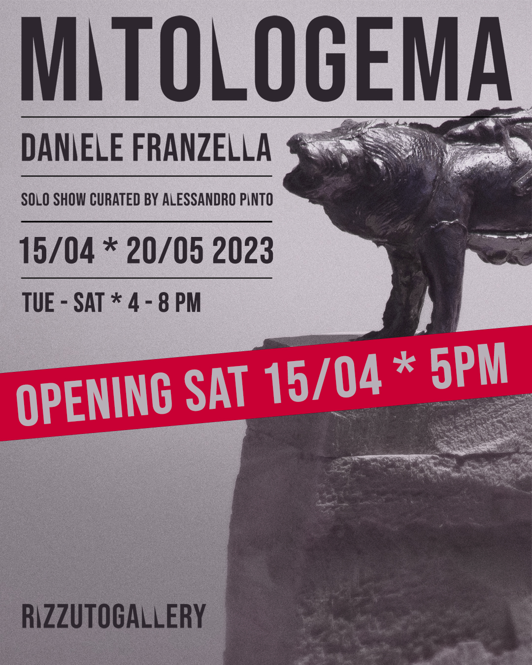 RizzutoGallery è orgogliosa di presentare MITOLOGEMA mostra personale di Daniele Franzella, a cura di Alessandro Pinto. La mostra sarà inaugurata sabato 15 aprile 2023 alle ore 17 e resterà visitabile fino al 20 maggio, dal martedì al sabato, dalle 16 alle 20.