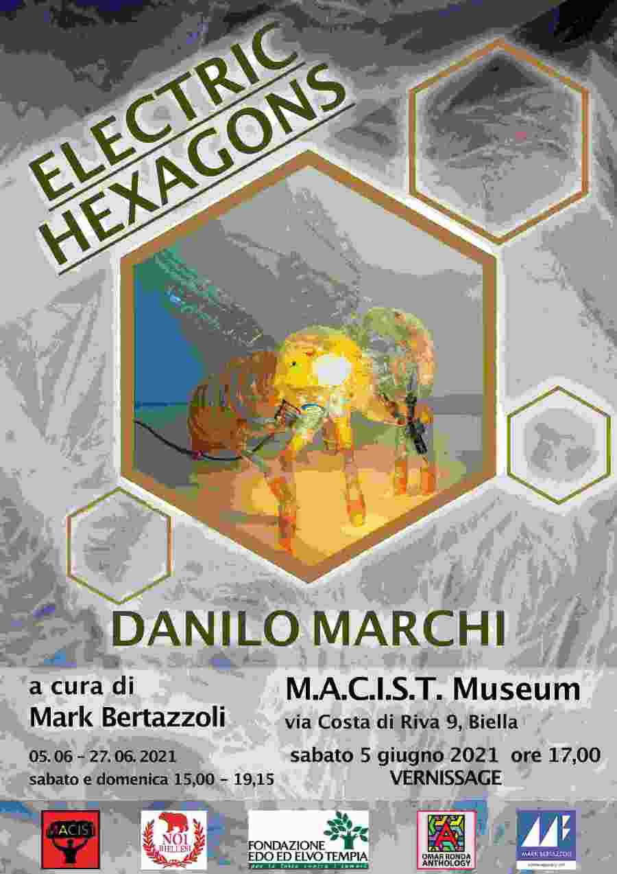 Electric Hexagons, installazione parzialmente a parete e in gran parte fluttuante, si compone di un compatto sciame di api luminose in movimento. Al centro della scena emerge il loro rifugio: un alveare naturale organizzato mediante le tipiche celle a esagono (considerato da Pitagora come la figura geometrica “perfetta”). Accanto all’alveare lo spettatore potrà distinguere l’ape regina, fonte di equilibrio e indispensabile per la sopravvivenza del gruppo. Ognuna di queste tecnologiche api danzanti, catturate in pose di volo differenti e realizzate in diverse sfumature di colori (giallo, arancione, blu, verde e parti trasparenti), si caratterizza per l’aggiunta di piccoli componenti elettrici, di lampadine a incandescenza e, soprattutto, dell’illuminazione a led. Le luci rendono le sculture più vive e suggestive ed evidenziano meglio le peculiarità anatomiche e morfologiche dell’insetto, rielaborato da Marchi nella sua composita struttura “architettonica”.