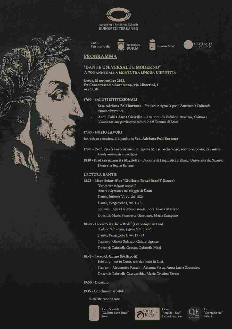 Insieme agli ospiti istituzionali e agli esperti in materia, saranno protagonisti dell’incontro anche alcuni studenti del Liceo Scientifico “Giulietta Banzi Bazoli, del Liceo “Virgilio – Redi” di Lecce-Squinzano e del Liceo Quinto Ennio di Gallipoli, accompagnati dai loro docenti. Questo, nella prospettiva di contribuire al coinvolgimento delle giovani generazioni nelle celebrazioni di questa importante ricorrenza e al fine di stimolare, nei ragazzi, un sentimento partecipativo e consapevole, atto a costruire una più matura coscienza del grande lascito di storia, cultura e conoscenza costituito dall’opera e dal pensiero di Dante.