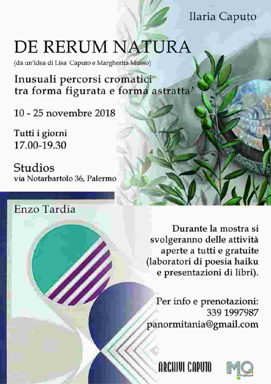 Venerdì 9 novembre 2018 alle ore 18.30 presso i locali di Studios (Palermo, via Notarbartolo 36) sarà inaugurata la mostra bi-personale di Ilaria Caputo e Enzo Tardia “De Rerum Natura. Inusuali percorsi cromatici tra forma figurata e forma astratta”.