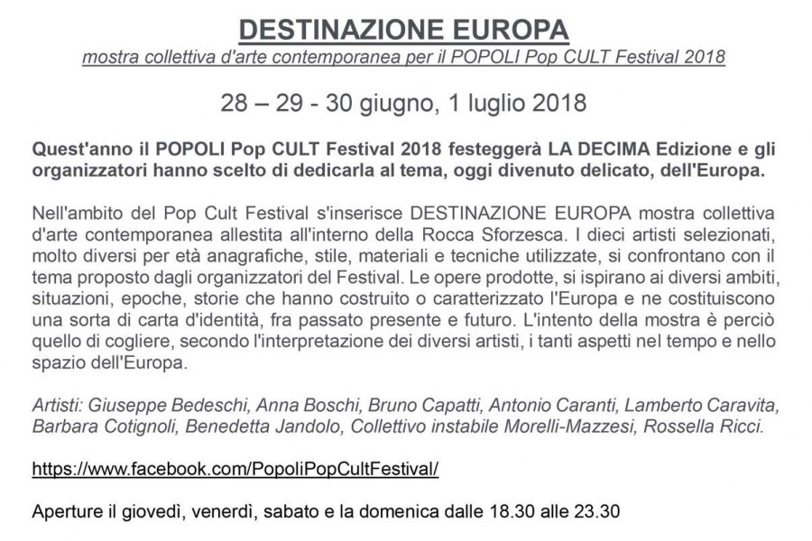 Nell'ambito del PopCult Festival s'inserisce DESTINAZIONE EUROPA mostra collettiva d'arte contemporanea allestita all'interno della Rocca Sforzesca. I dieci artisti selezionati, molto diversi per età anagrafiche, stile, materiali e tecniche utilizzate, si confrontano con il tema proposto dagli organizzatori del Festival. Le opere prodotte, si ispirano ai diversi ambiti, situazioni, epoche, storie che hanno costruito o caratterizzato l'Europa e ne costituiscono una sorta di carta d'identità, fra passato presente e futuro. L'intento della mostra è perciò quello di cogliere, secondo l'interpretazione dei diversi artisti, i tanti aspetti nel tempo e nello spazio dell'Europa.