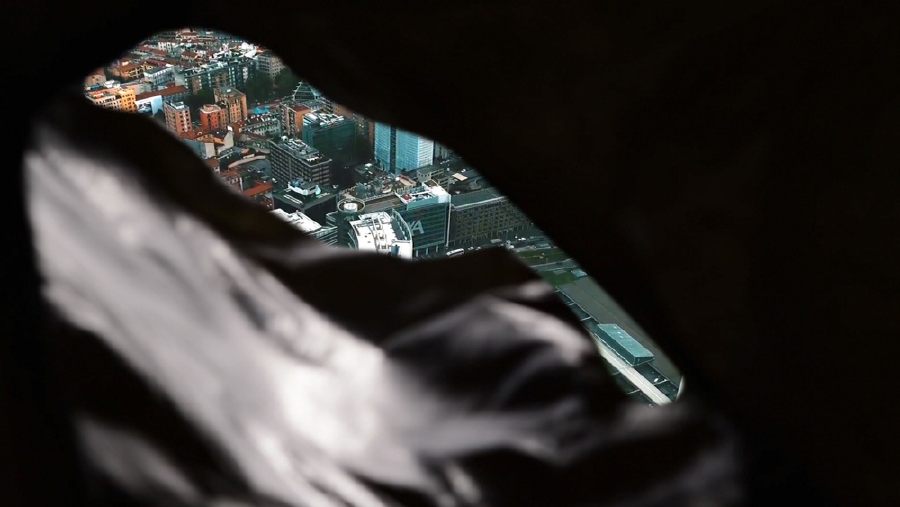 La serie Graffiti riporta all’istintualità della forma che cita istoriazioni parietali. La serie Rainbow Pieces sperimenta traiettorie cromatiche che scompongono lo spettro visibile. In entrambe le serie di sculture in tessuto emerge la riflessione sulla superficie tensiva generata da elastam monocromi, oltre la quale si strutturano display incontrollabili di oggetti. In Graffiti la superficie cromatica è dunque un territorio di crossover in cui avviene il transfert tra interno oggettuale ed esterno visuale, tra contenuto e forma, tra concretezza e astrazione, tra fisico e metafisico. La superficie è luogo tellurico di sommovimenti, su cui si registra come anatomia esteriore ogni fenomeno interiore. In Rainbow Pieces la pratica di contatto tra gli oggetti si estremizza e diviene strutturale nel riferimento architettonico della tipologia dell’arco, a partire dalla conformazione dell’arcobaleno. In Unframed, Devis Venturelli inverte il punto di vista ricorrendo al video. L’obbiettivo della camera è all’interno di una nebulosa nera, fluttuante, cavernosa, misteriosa che in una performance aerea scopre un overview urbano.