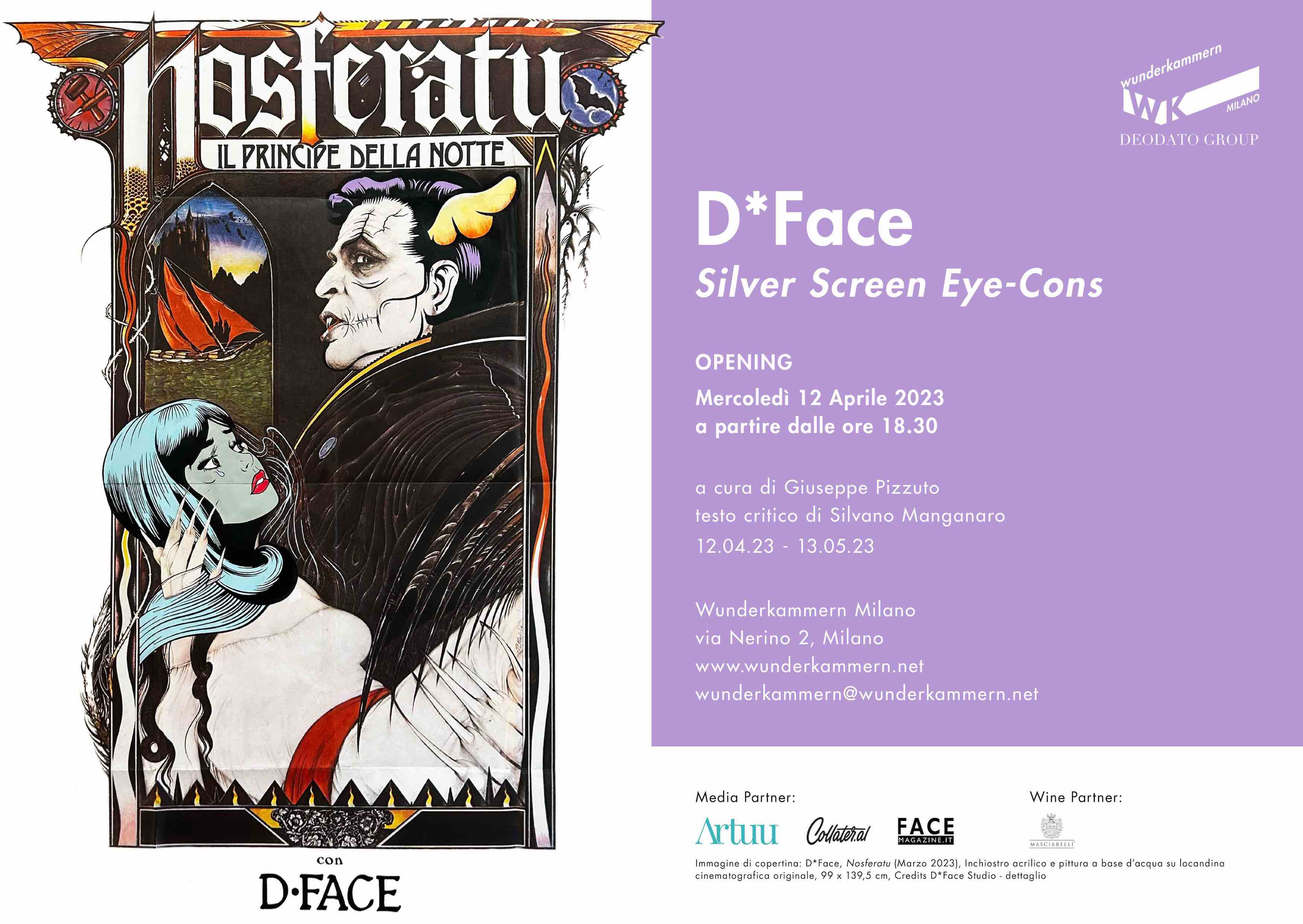 Silver Screen Eye-Cons è il titolo della nuova mostra proposta dalla galleria Wunderkammern nella sua sede di Milano in Via Nerino 2, realizzata dall’artista londinese D*Face. L’esposizione è curata da Giuseppe Pizzuto con testo critico di Silvano Manganaro, docente all'Accademia di Belle Arti dell’Aquila.