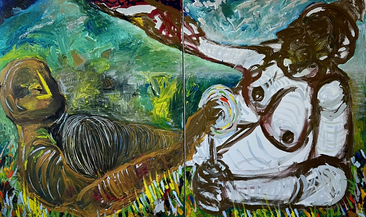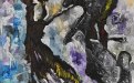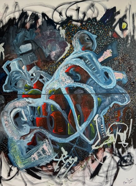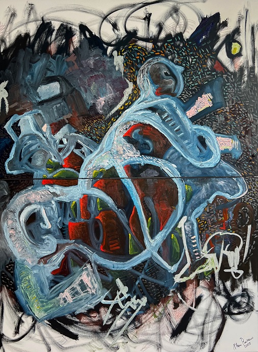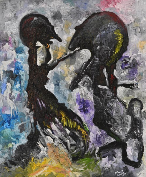 Ne La partenza, un olio su tela di 100x120 del 2024, l’artista scatta una foto fissando il momento dei saluti tra una madre ed un figlio, un addio, un arrivederci, un bentornato non ci è dato sapere, ma la vibrazione interna al quadro i suoi toni scuri, i corpi ridotti a sagome nere ricordano più i negativi di una foto analogica e fanno solo percepire la forma, abbandonando anatomie e andando a scavare nei sentimenti dei due protagonisti, togliendo ciò che può distrarre, per concentrarsi sul distacco e sul dolore di questo allontanamento innaturale.