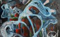 Corpi antropomorfi disperati, su un fondo elettrico, acido, indigeribile, fluttuanti ed al contempo pesanti, fatti di piombo, dinamici nella forma, ma paralizzati dalla mancanza, quasi urlanti, ma senza parole, patiscono di questo distacco e dialogano con ciò che di più profondo abbiamo: le viscere, perdendo pezzi ovunque, straziati da questo che a me pare essere un addio.