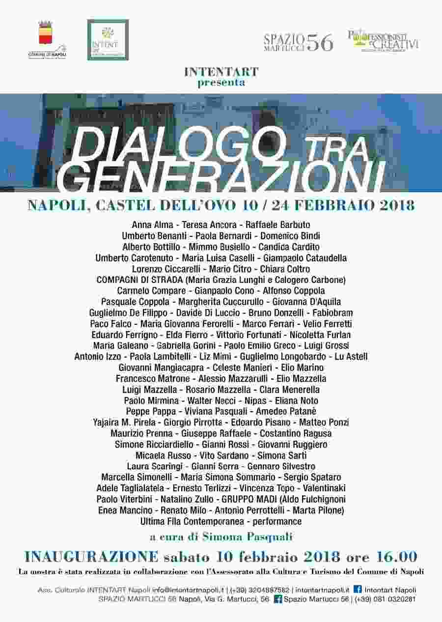 La mostra “DIALOGO TRA GENERAZIONI”, promossa dall’Associazione culturale INTENTART e curata dalla dott.ssa Simona Pasquali, focalizza l’attenzione su un confronto tra diversi modi di concepire l’arte, un dialogo che coinvolge generazioni diverse che si uniscono come segno tangibile di un’arte orientata a nuovi orizzonti.