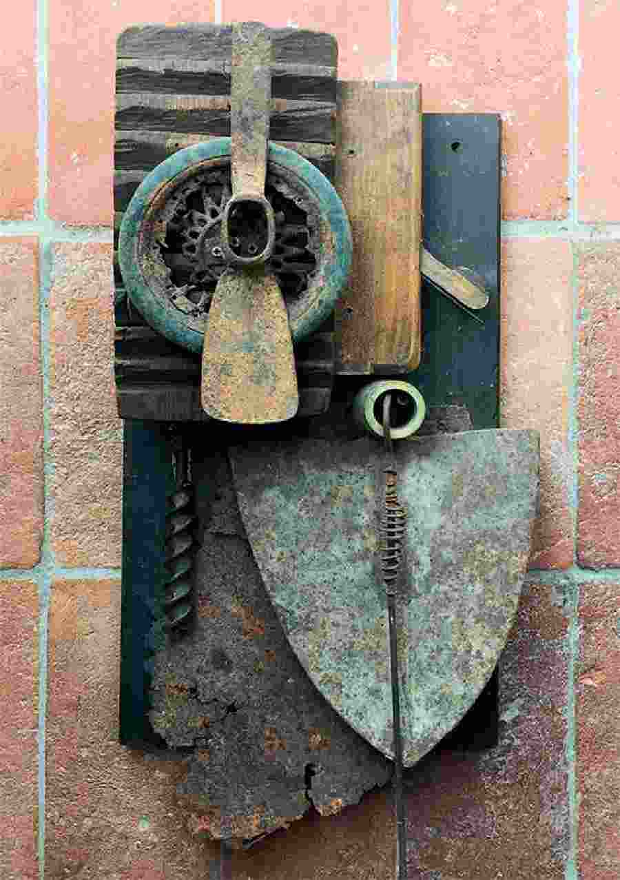 “Nel 2000 abbiamo comprato una fattoria del Cinquecento con un uliveto nelle colline sopra Ponte a Moriano, abbandonata da quindici anni – racconta l’artista -. Diversi attrezzi agricoli abbandonati sul terreno nel corso dei secoli sono diventati materia prima per le installazioni. Sono i materiali dell’Arte Povera: strumenti tradizionali come la vanga e rastrello, antiche serrature e chiavi, composti assieme ad assi di legno stagionato. Questi oggetti parlano di un modo di vivere che sta gradualmente scomparendo e che voglio sia ricordato. Inoltre, ho realizzato una serie di collage su carta ispirati dai cambiamenti di luce e dagli effetti atmosferici che il tempo causa sui contorni del paesaggio che osserviamo. Illuminato dal sole, avvolto da veli di nebbia o ombreggiato da nuvole, questo è sempre affascinante è fonte costante di ispirazione. Il rapporto con l’ambiente, anche costruito, è fondamentale per l’espressione artistica”.
