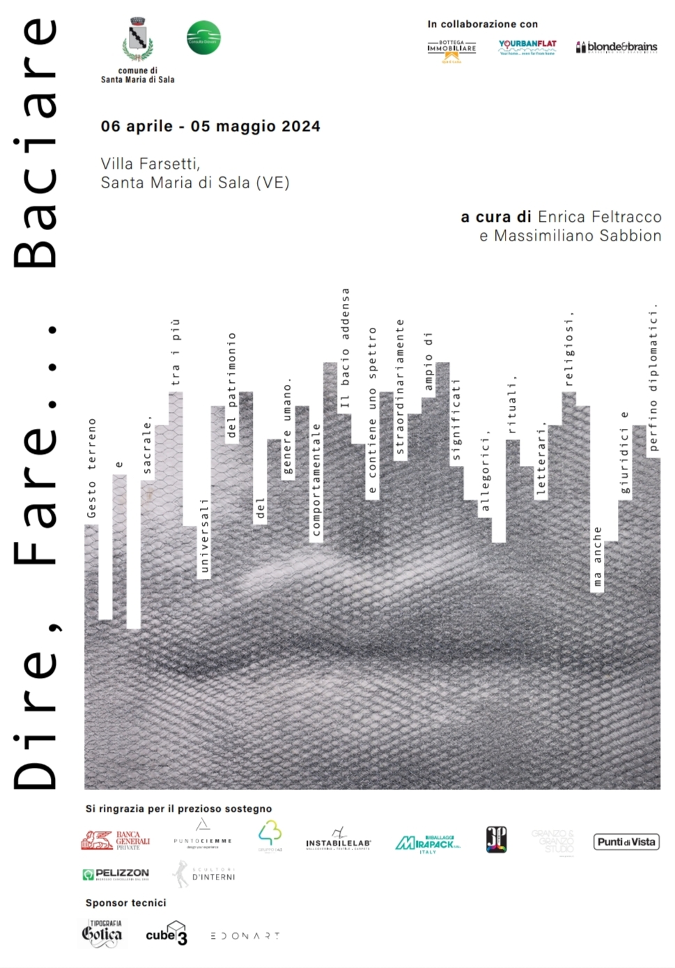 Il Comune di Santa Maria di Sala, nelle splendide sale di Villa Farsetti, presenta la mostra “Dire, Fare … Baciare”, organizzata dai curatori Enrica Feltracco e Massimiliano Sabbion insieme a Yourbanflat, Bottega Immobiliare e Blonde and Brains, in una intensa collaborazione con gli assessori Silvia Casari e Daniel Basso. L’esposizione presenta 40 artisti che attraverso differenti linguaggi artistici, dalla video arte alla scultura, dalla pittura alla fotografia alla street art affrontano il tema universale del “bacio”.