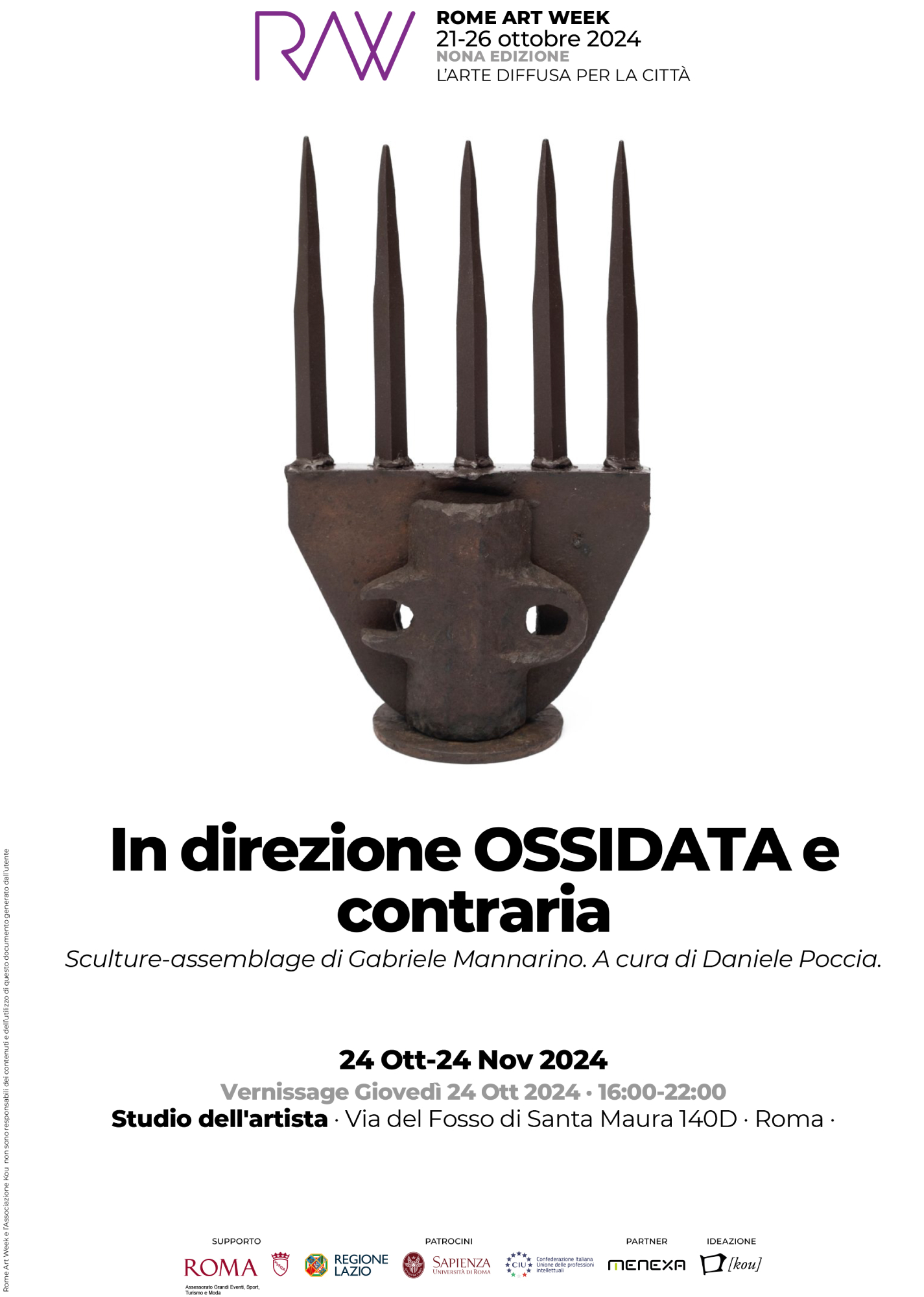 Le sculture-assemblage di Gabriele Mannarino, in mostra per la prima volta, sono realizzate ricomponendo oggetti quotidiani, prevalentemente in metallo, che sono stati dismessi come rifiuti. L'ossidazione è testimonianza del fluire del tempo e della vita poiché è un processo del tutto analogo a quelli che permettono la sopravvivenza degli esseri umani e di tutte le specie aerobie sulla terra. I suoi esiti sono frutto di specifiche condizioni legate sia allo stato iniziale del manufatto che all’ambiente a cui è stato esposto: è quindi possibile dire che ciascun elemento ossidato porta fisicamente con sé una propria, unica storia e, tramite la ricomposizione, ne inizia un’altra.