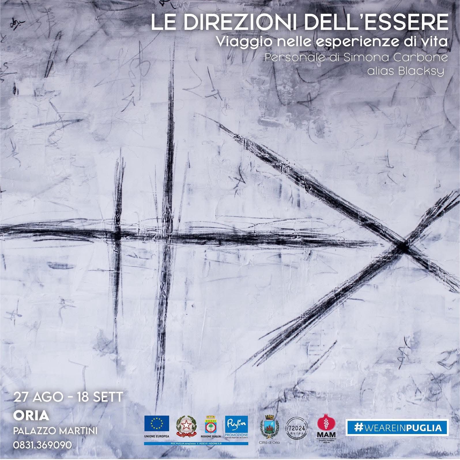 L'Associazione Culturale 72024 è lieta di annunciare l'apertura della mostra personale dell'artista Simona Carbone, conosciuta nell'ambito artistico con il nome di Blacksy. La mostra, intitolata “Le direzioni dell'essere”, avrà luogo dal 27 agosto al 18 settembre 2025 presso i prestigiosi spazi storici di Palazzo Martini, situato in Piazza Domenico Albanese 5 ad Oria. L'iniziativa è patrocinata dal Comune di Oria e rientra all'interno del programma di co-progettazione culturale avviato dall'Amministrazione Ferretti e dal 2° Settore, mirato a promuovere la ricerca artistica contemporanea in un contesto carico di significato storico e simbolico.