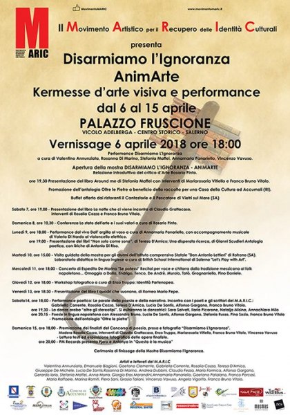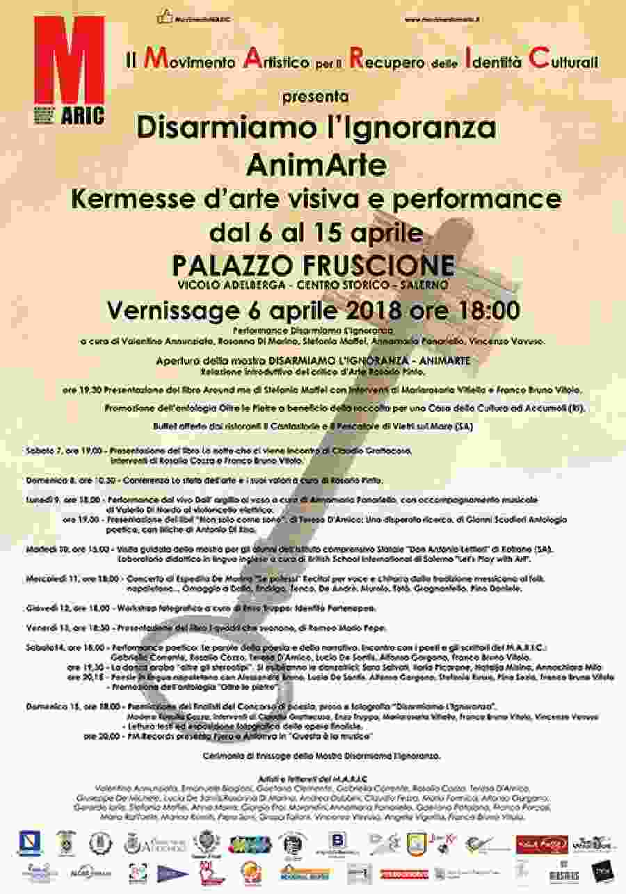 La mostra Disarmiamo l’Ignoranza - AnimArte, patrocinata dal Comune di Salerno, organizzata dall’Associazione MARIC (Movimento Artistico per il Recupero delle Identità Culturali) ed in esposizione a Salerno a Palazzo Fruscione, sarà inaugurata il 6 aprile alle ore 18, con una provocatoria performance. Gli artisti, guidati dal Fondatore e Presidente del Maric, Vincenzo Vavuso, arriveranno dall’adiacente via Mercanti al vicolo Adelberga, sede dell’esposizione, camminando su uno strato di libri e vestiti di soli giornali. La Mostra sarà presentata dal critico d’arte Rosario Pinto.