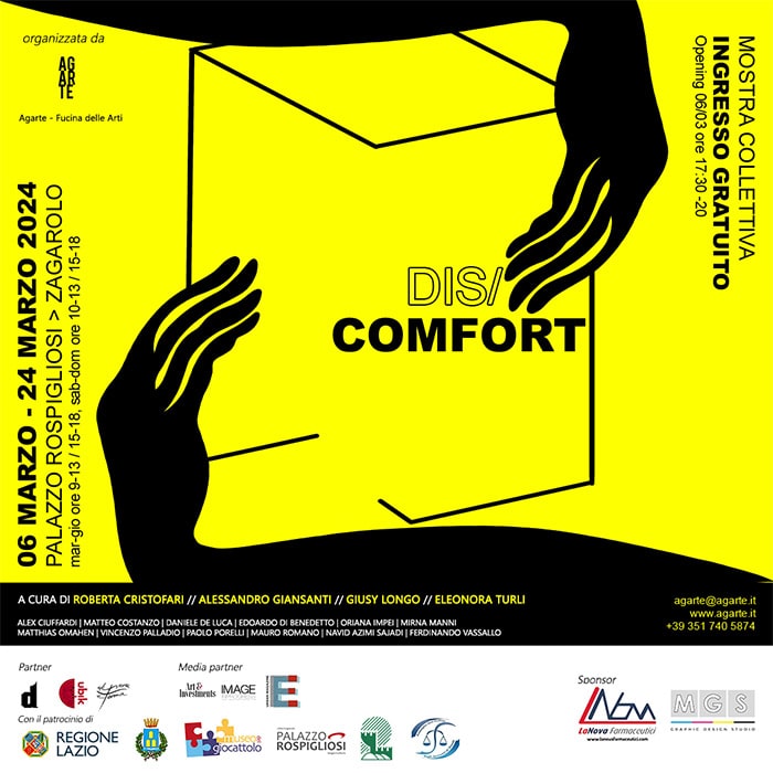 Durante la rassegna Marzo, Illimitati diritti: genitorialità, comunicazione e disparità di genere, che si svolgerà a Palazzo Rospigliosi di Zagarolo all’interno del contesto di Ex Marzo Donna in collaborazione con l’assessorato alle politiche sociali e al delegato alla cultura, si terrà la mostra collettiva DIS/COMFORT che coinvolge 12 artisti attivi nel panorama nazionale ed internazionale contemporaneo selezionati dai curatori Roberta Cristofari, Alessandro Giansanti, Giusy Longo, Eleonora Turli e dall’Associazione Culturale e Galleria d’Arte Agarte – Fucina delle Arti. L’esposizione ospita i lavori di: Alex Ciuffardi, Matteo Costanzo, Daniele de Luca, Edoardo Di Benedetto, Oriana Impei, Mirna Manni, Matthias Omahen, Vincenzo Palladio, Paolo Porelli, Mauro Romano, Navid Azimi Sajadi e Ferdinando Vassallo.