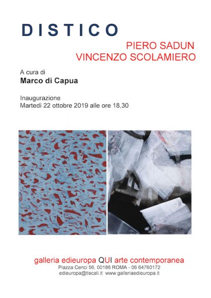 Si inaugura martedì 22 ottobre alle ore 18,30 presso la Galleria Edieuropa di Roma, la mostra “DISTICO – Piero Sadun Vincenzo Scolamiero”, a cura di Marco Di Capua.