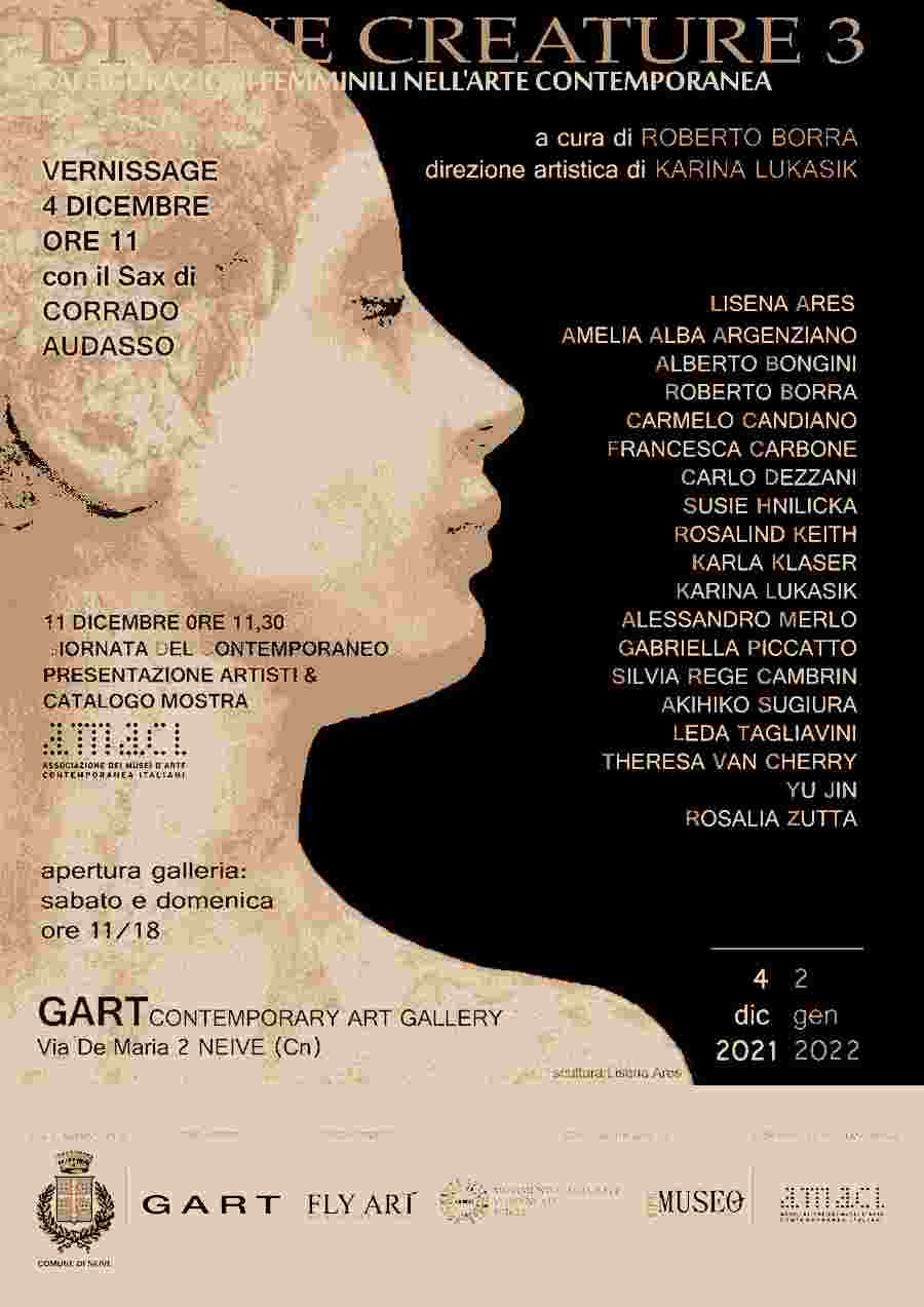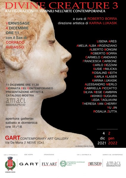 La terza tappa della mostra itinerante Divine creature.Raffigurazioni femminili nell’arte contemporanea a cura di Roberto Borra e la direzione artistica di Karina Lukasik , nella sua nuova veste, approda nelle terre del Barbaresco e più precisamente nella Galleria d’arte Gart di Neive uno dei 10 più bei borghi d’Italia. L’Associazione Culturale Fly Art di Torino porta tra le meravigliose colline delle Langhe questa esposizione itinerante, presentata nel 2019 con l’Associazione Collettivo 37 negli spazi del Palazzo Antonelliano della galleria d’Arte Moderna e Contemporanea Artgallery 37 a Torino e nel 2020 a Palazzo Lucerna di Rorà, sede del Museo Archeologico di Bene Vagienna(Cn). La Galleria Gart di Neive che ha sede in una suggestiva cantina con volta a botte seicentesca, è un vero luogo dell’anima storica, culturale e produttiva di questa terra meravigliosa, entrata nel Patrimonio dell’Umanità Unesco nel 2014. L’esposizione, in veste totalmente rinnovata, si presenta al visitatore come un articolato affresco di “libere interpretazioni” dell’universo femminile che dalla classicità ci conducono al contemporaneo attraverso la pittura, la scultura e la fotografia. La varietà delle origini dei protagonisti della mostra (Italia, Polonia, Lituania, Svizzera, Croazia, Inghilterra, Cina e Giappone ) offre un’occasione di apertura ed approfondimento in chiave internazionale della tematica femminile. In mostra opere che tratteggiano le virtù ma anche le fragilità della donna, la complessità della sua esistenza e l’atemporalità dei suoi sogni , il coraggio delle sue scelte, la leggerezza e l’inquietudine della quotidianità. Il magico antro della Galleria d’arte Gart gestita da Annalisa Ghella e posta nell’animatissimo centro storico di Neive, accoglie le opere che riprendono i fili dispersi dell’esistenza delle donne per ricomporli in un intenso tessuto di visioni, esperienze , sensazioni e testimonianze, sospese tra poetica, simbologia e realtà. Di grande rilievo la presenza in mostra dell’olio su tavola Da Leonardo Da Vinci. Monna Lisa di Carmelo Candiano, uno dei componenti del Gruppo dei nove di Scicli, il cenacolo di artisti celebrato da Renato Guttuso, che faceva capo al maestro Piero Guccione. In Divine Creature le opere sono in fondo specchi di condizioni interiori, vissuti profondi che sorseggiano alle fonti di una travagliata ed intima purezza lontana anni luce dall’esteriorità dell’iconografia espressa dal sistema mediatico e dalla parte più arcaica della società civile. Un luogo ed un evento dal quale il visitatore potrà trarre nutrimento per illuminare con un’intensa e significativa luce, alcuni degli aspetti essenziali dell’interiorità femminile. Sguardi di vissuto che attraverso la porta d’accesso dell’arte accomunano trasversalmente e fisicamente culture e generazioni, linguaggi ed identità. Un’esposizione di arte contemporanea internazionale che si propone come una primavera della condizione femminile, ricca di colori e chiaroscuri, di profumi e di sentori raffinati ed inebrianti, da assaporare con lentezza…come un buon calice di Barbaresco...