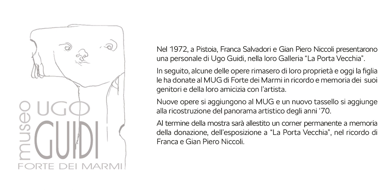 Il Museo Ugo Guidi – MUG di Forte dei Marmi presenta la 195° mostra intitolata “Ugo Guidi – Donazione Niccoli”. Nel 1972, a Pistoia, Franca Salvadori e Gian Piero Niccoli presentarono una personale di Ugo Guidi, nella loro Galleria “La Porta Vecchia”. In seguito, alcune delle opere rimasero di loro proprietà e oggi la figlia le ha donate al MUG di Forte dei Marmi in ricordo e memoria dei suoi genitori e della loro amicizia con l’artista. Nuove opere si aggiungono al MUG e un nuovo tassello si aggiunge alla ricostruzione del panorama artistico degli anni ‘70.