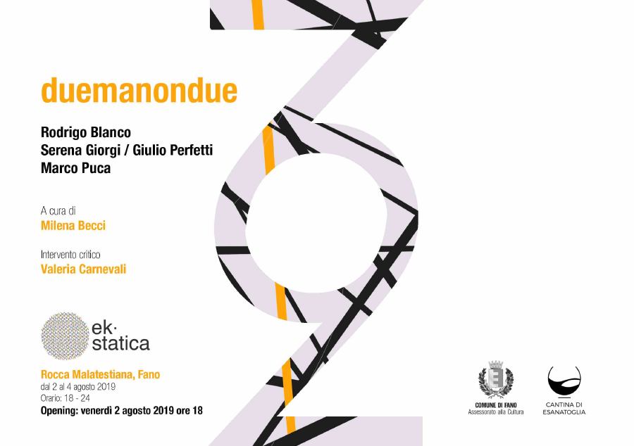 Venerdì 2 agosto alle ore 18 inaugura duemanondue, il progetto espositivo a cura di Milena Becci, con un intervento critico di Valeria Carnevali, ospitato da Ek-statica 2019 con il Patrocinio del Comune di Fano Assessorato alla Cultura. Il percorso si sviluppa in tre spazi della Rocca Malatestiana di Fano e presenta le opere di Rodrigo Blanco, Serena Giorgi con Giulio Perfetti e Marco Puca.