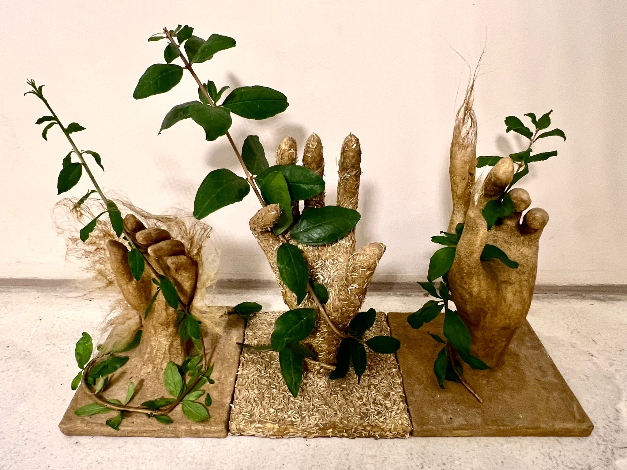 Nel dialogo gli artisti pugliesi presenti: Gianni Chiriatti con assemblaggi di piante, Claudio Rizzo con “Il ciclo del divenire”, una scultura realizzata con la texture di una foglia di ficodindia, Luigi Caiffa con “Rinascita” composto da tre sculture di mani realizzate con materiali eco-sostenibili e fogliame vario.