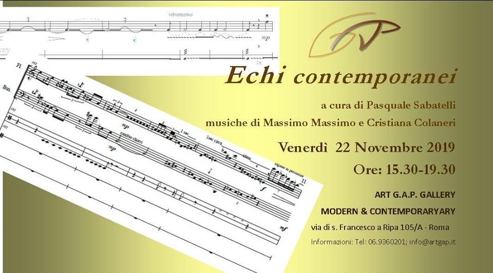 La galleria ART GAP in occasione della chiusura della mostra personale di Massimo Fiocco, STAGIONI, è lieta di accogliere la performance musicale ECHI CONTEMPORANEI curata da Pasquale Sabatelli il 22 novembre 2019, dalle 15.30 alle 19.30 con i musicisti Massimo Massimi e Cristiana Colaneri presenti in sala.