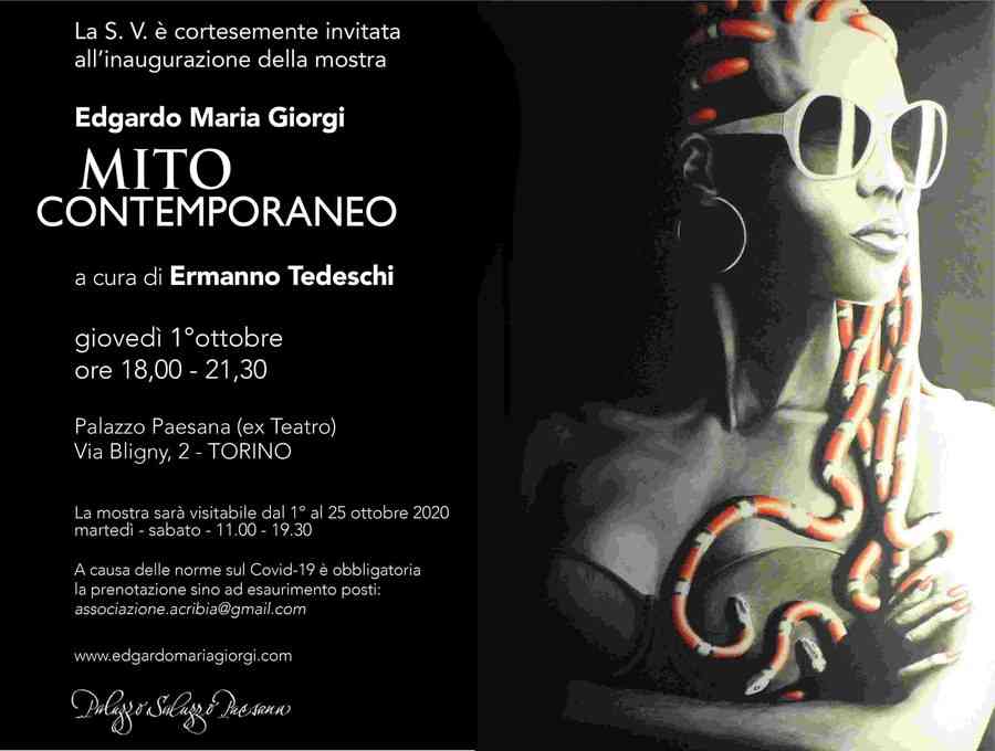 Obiettivo della mostra Mito Contemporaneo personale di Edgardo Maria Giorgi, curata da Ermanno Tedeschi a Teatro Paesana a Torino dal 1° al 25 ottobre 2020, è di ambientare con ironia e fantasia i personaggi della mitologia nel mondo contemporaneo esaltandone le stravaganze, i vizi e le virtù dimostrando attraverso una fantasiosa raffigurazione che nulla è cambiato in 3000 anni di storia. Nelle sue opere gli occhi quasi parlanti e la sinuosità dei corpi emergono in modo evidente.